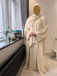 The beautiful Marwah abaya set includes an open abaya, an inner slip dress, and a hijab.